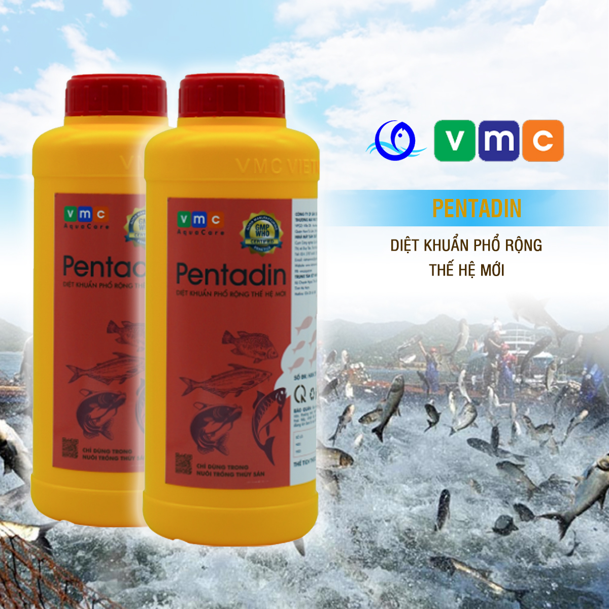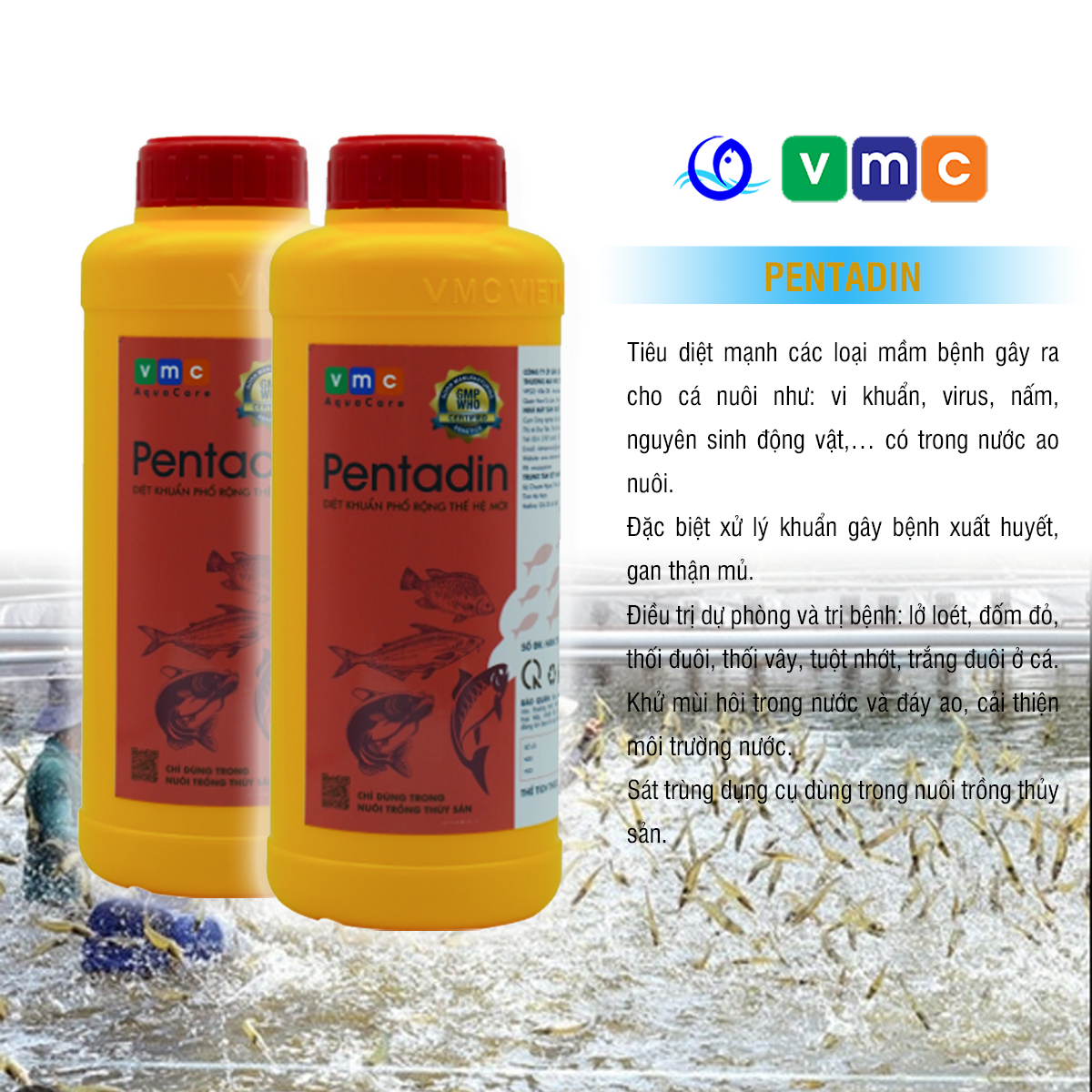 PENTADIN là một sản phẩm chất lượng cao được thiết kế đặc biệt cho ngành thủy sản. Các thành phấn trong sản phẩm diệt khuẩn, nấm cải thiện môi trường nuôi giúp cá/tôm khỏe mạnh, tăng năng suất.