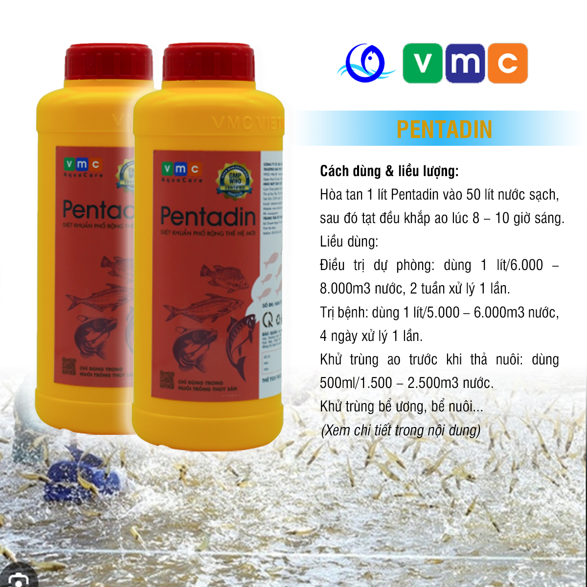 Hòa tan 1 lít Pentadin vào 50 lít nước sạch, sau đó tạt đều khắp ao lúc 8 – 10 giờ sáng.